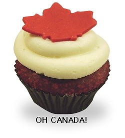 Oh Canada! A red velet cupcake topped with vanilla cream cheese frosting and a chocolate maple leaf