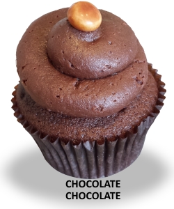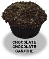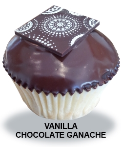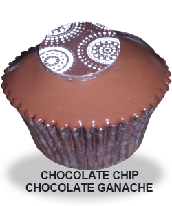 Vanilla cupcake with Chocolate Chips , topped with Chocolate Ganache and a Chocolate disc