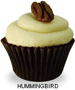 Classic US southern banana, pineapple, pecan cupcake with cream cheese frosting topped with a roasted pecan