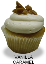 Vanilla cupcake filled with caramel sauce topped with buttercream and english toffee bits
