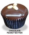 Chocolate cupcake filled with peanut butter mousse topped with chocolate ganache and peanuts