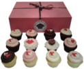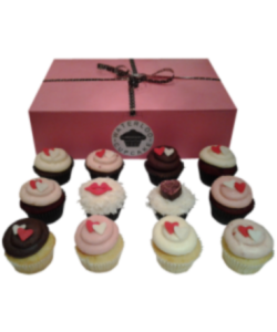 We have designed and packaged a delicious selection of a dozen Valentine's Day Cupcakes including one topped with a heart shaped chocolate truffle. Beautifully boxed and decorated these cupcakes come with an enevelope, card, and your personal message.