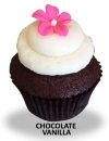 Chocolate cupcake topped with a vanilla buttercream frosting and a chocolate flower