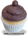 Vanilla cupcake with Chocolate Chips , topped with Chocolate Ganache and a Chocolate disc